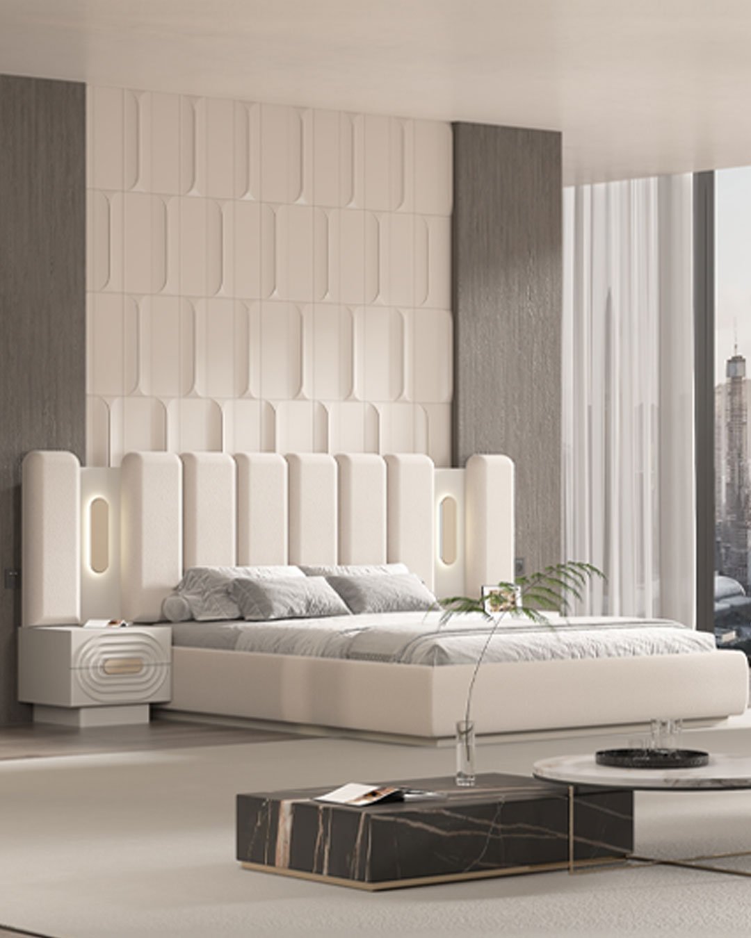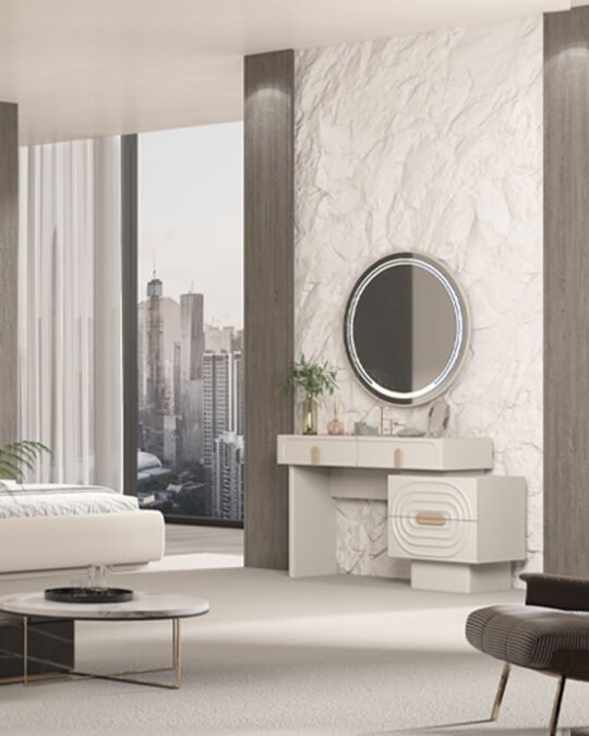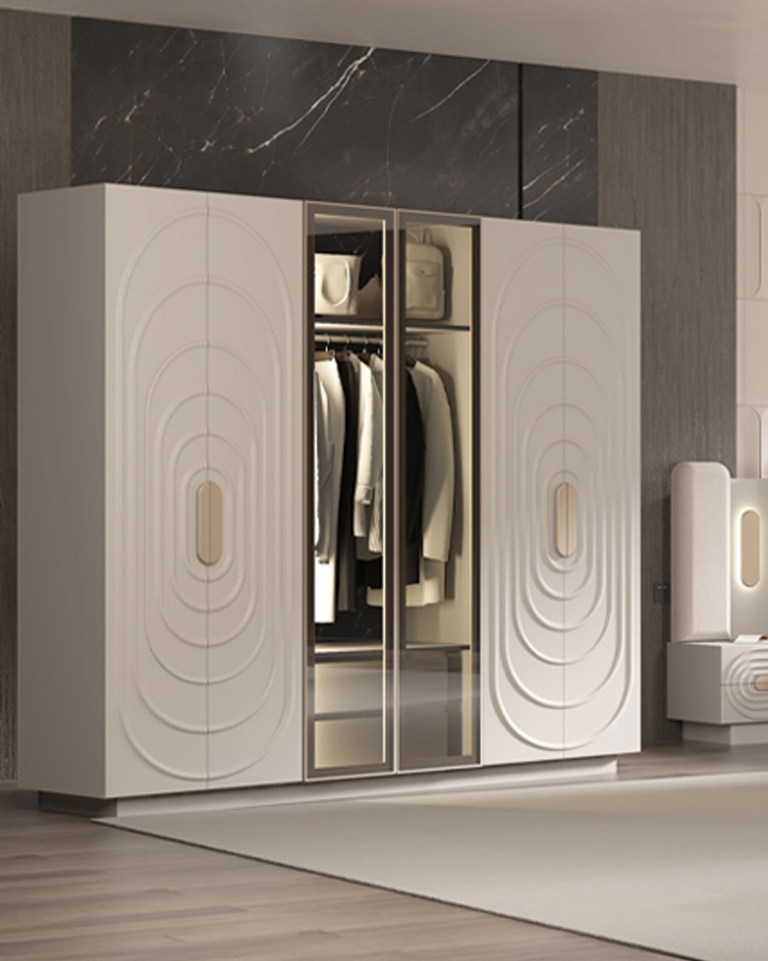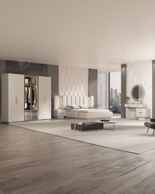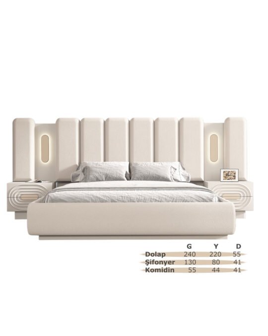 GALAKSİ Yatak Odası Takımı, modern tasarımı ve fonksiyonel parça yapısıyla yatak odasında bütünlüklü bir şıklık arayanlar için tasarlanmıştır. Takımın ayırt edici çizgisi; oval formda kapak ve çekmece yüzeyleri ile sağlanan yumuşak, sofistike görünümüdür. Geniş dolap yapısı, eşyalarınızı düzenli tutmanıza yardımcı olurken; şifonyer ve komodinler günlük kullanımda pratik depolama alanı sunar. Karyola ile birlikte uyumlu bir takım bütünlüğü oluşur ve mekânda modern bir atmosfer sağlar.