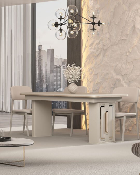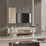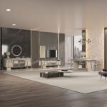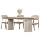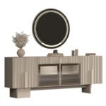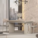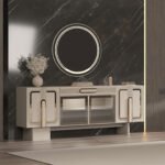 Konsol ve TV ünitesinde yer alan camlı bölmeler, zarif metal çerçevelerle birleşerek hem dekoratif parçalarınızı sergileyebileceğiniz hem de düzeni koruyabileceğiniz estetik bir alan sunar. Aynalı konsol ise mekânda derinlik hissini artırır ve takımın şıklığını tamamlar. Yemek masası, günlük kullanım ve misafir ağırlama için ideal ölçülerle tasarlanmıştır.