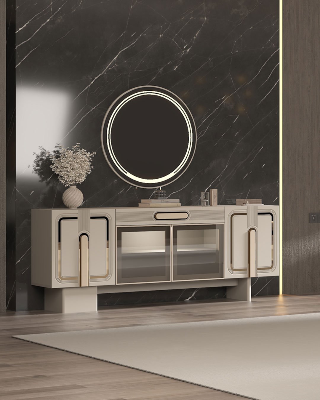 Konsol & TV ünitesi: camlı bölmelerle sergileme + depolama alanı