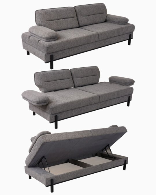 Sovano Nur Koltuk Takımı, konforu artıran yatak mekanizması, oturumu büyüten yana açılır kol mekanizması ve ekstra depolama sağlayan sandık mekanizması ile fonksiyonel bir kullanım sunar. Gürgen iskelet, 32 DNS sünger, ithal silinebilir kumaş ve 2 yıl garanti ile uzun ömürlüdür.