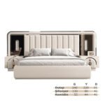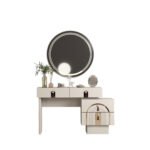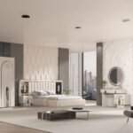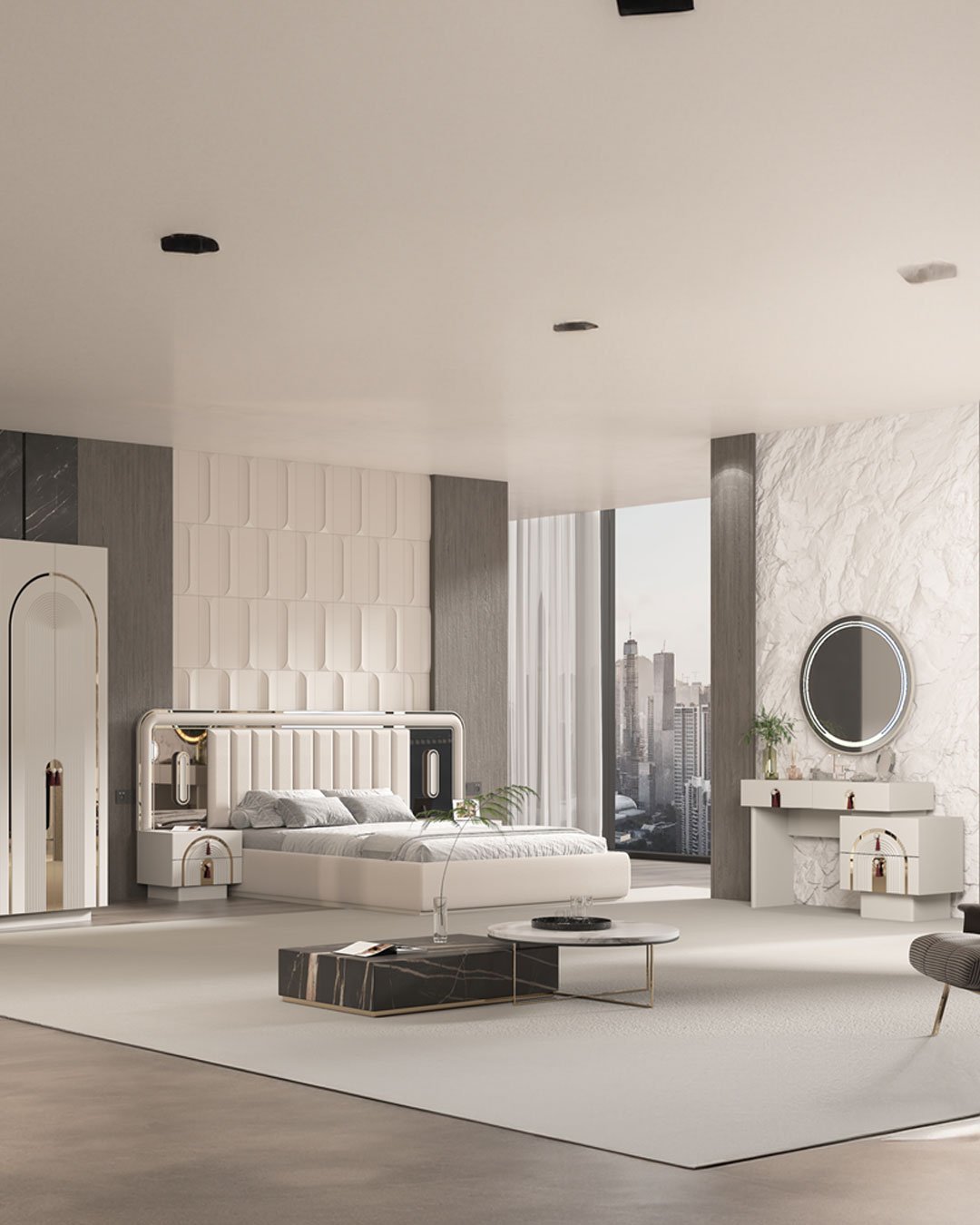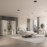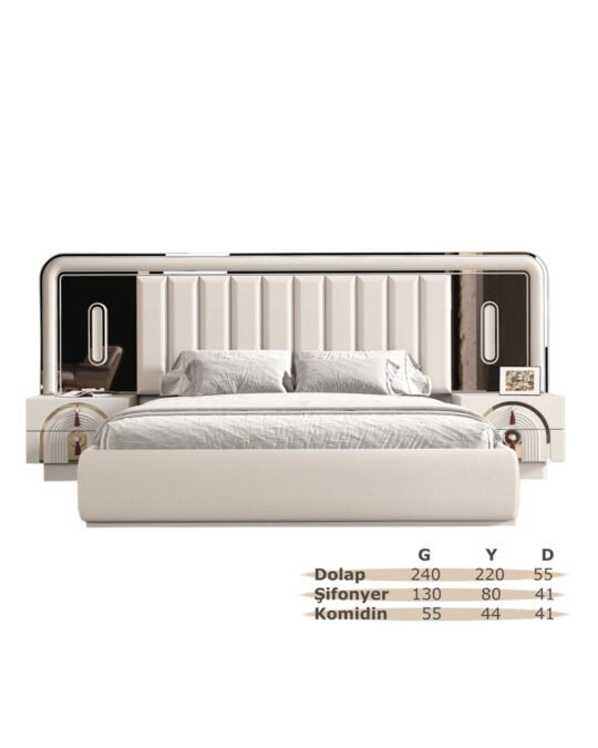 Karyola başlığı, geniş ve dikey çizgilerle dolgulu döşeme yapısıyla hem konforlu bir destek sunar hem de yatak alanını güçlü bir odak noktasına dönüştürür. Başlığın yanlarında yer alan ayna detayları, takımın lüks karakterini tamamlar. Geniş hacimli dolap, depolama ihtiyacını pratik şekilde karşılamaya yardımcı olurken; şifonyer, kavisli çekmece formları ve yuvarlak aynasıyla hazırlık alanınızı daha kullanışlı hale getirir.