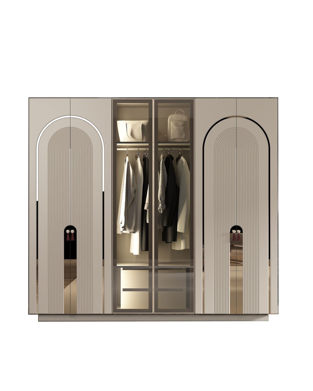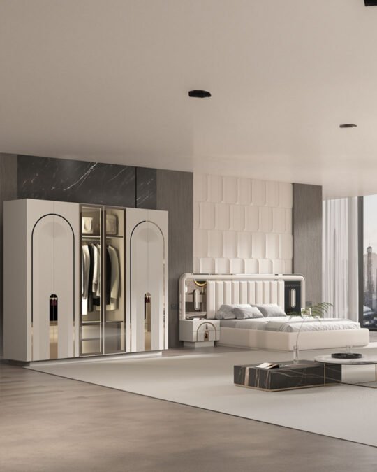 ROMA Yatak Odası Takımı, klasik çizgilerden ilham alan kavisli detayları modern yorumla buluşturarak yatak odasında dikkat çekici bir atmosfer oluşturur. Dolap ve şifonyer kapaklarında kullanılan kavisli (kemer formunu anımsatan) gold detaylar ve aynarlı paneller, mekâna daha aydınlık ve derin bir görünüm kazandırır.
